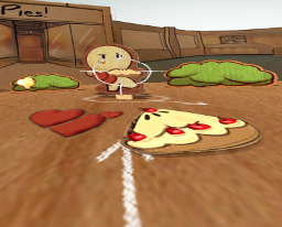 You can also see a targeting arrow on the ground, pointed at the same target. On the tip of that arrow are two important things about you, your health, and your current pie size.