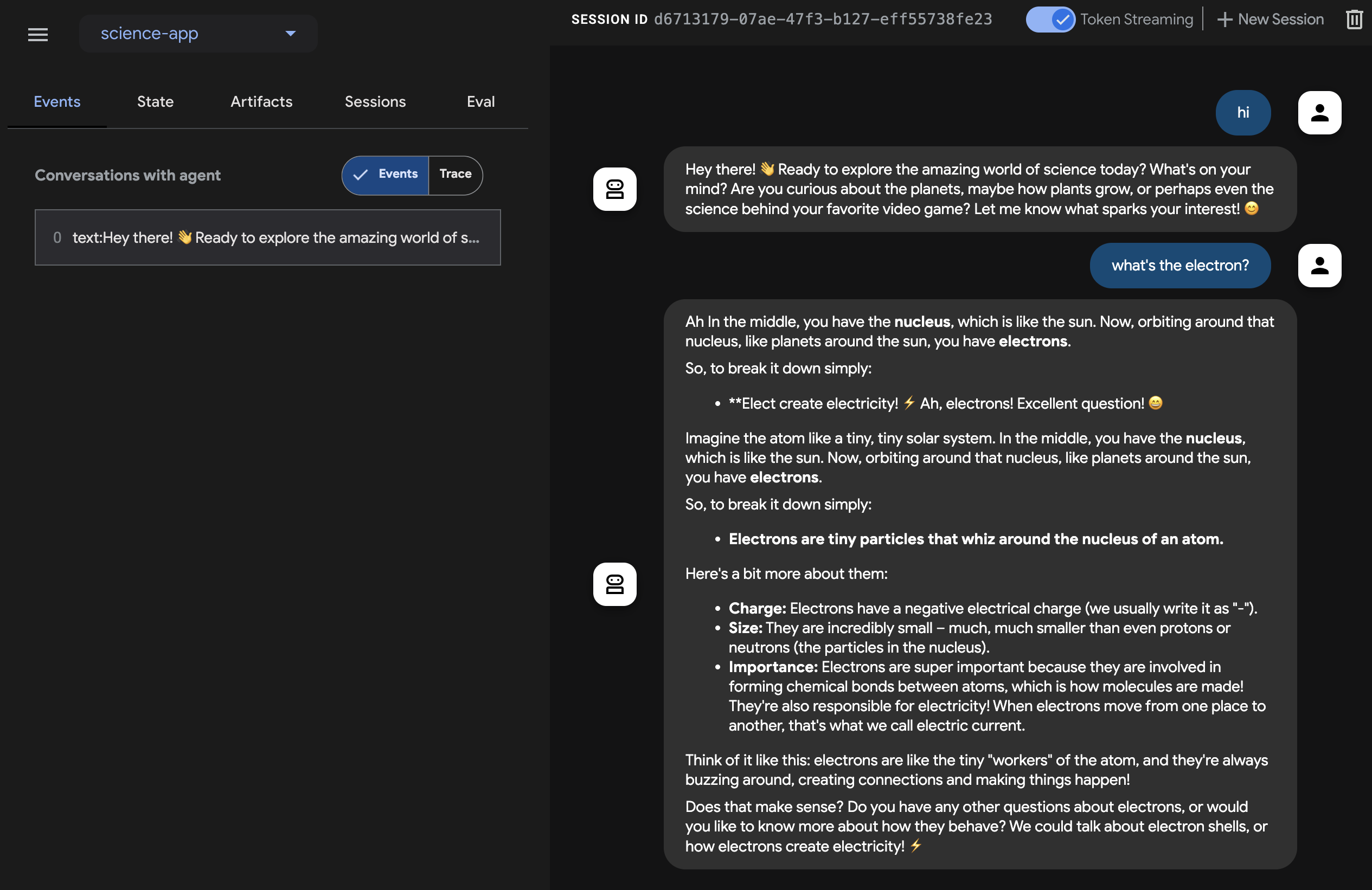 Click the Token Streaming switch at the top right, and ask any questions for the science teacher such as What's the electron?. Then you should see the output text in streaming on the UI.