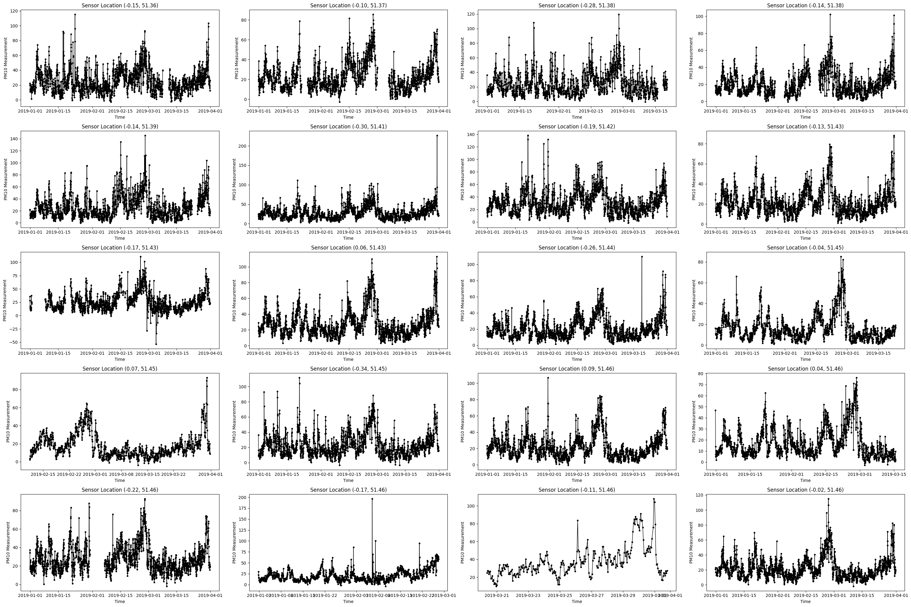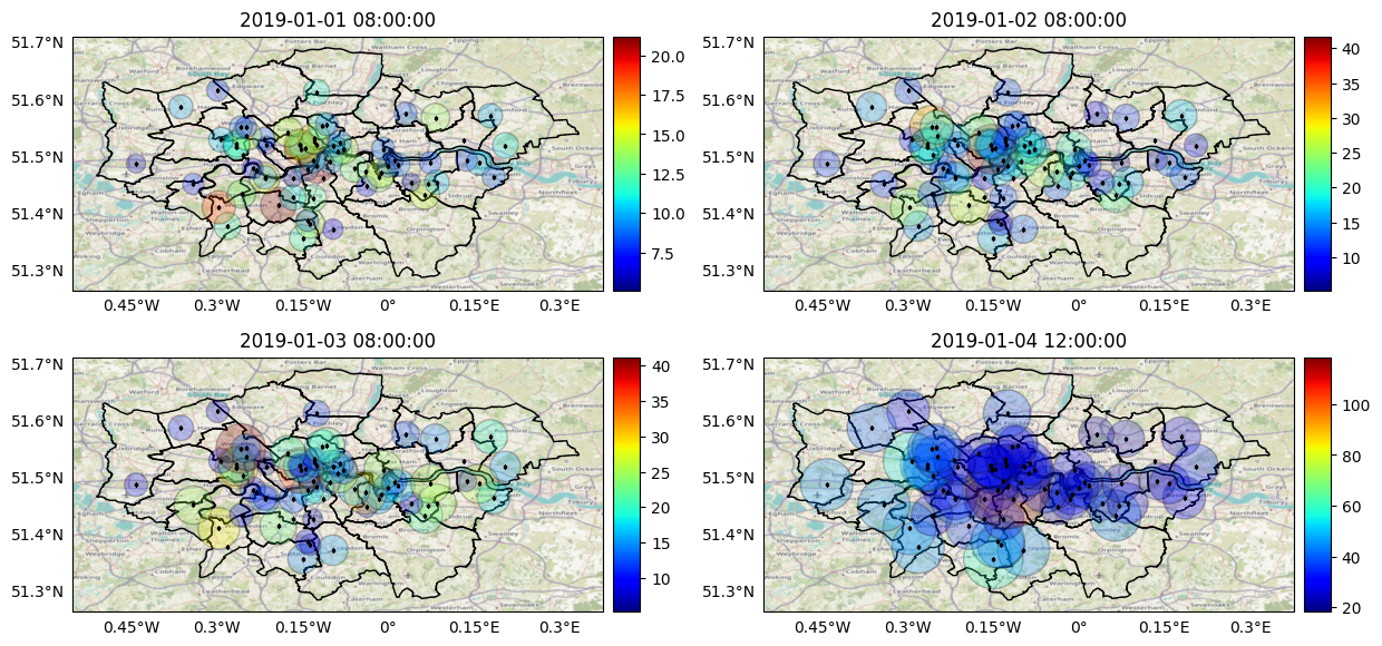 We analyze data from the London Air Quality Network https://www.londonair.org.uk/. The data contains air pollution levels measured by sensors across London, measured every hour.