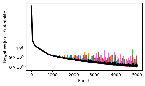 All three estimators provide a .fit method, with slightly different signatures. The configuration below trains an ensemble comprised of 64 particles for 5000 epochs. These commands require around 3 minutes on a TPU v3-8; the ensemble_size and num_epochs values should be adjusted depending on the available resources.