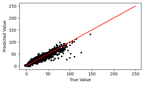 ax.scatter(df_test.pm10, yhat_quantiles[1], marker='.', color='k')